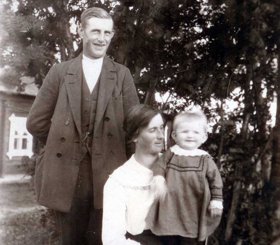 Johan Olof Molin född 1891 i Sunnansjö by med hustrun Ida Edlund född på Östansjö 1891. Ida med sonen Ivar i famnen, född 1918 i Sunnansjö by. Johan Olof här fint uppklädd med vit skjorta och västen uppknäppt ned till klockkedjan. Familjen är förmodligen fotograferade framför sin stuga. Men var de bodde på farfar Hans Hansson Molins hemman är lite osäkert. Ida blev tidigt änka då maken dog i cancer. Hon flyttade därefter med barnen tillbaks till föräldrahemmet på Östansjö. Detta foto kan vara ett s.k. "Kragefoto" i.o.m. att Erik Olof Krage bodde tvärs över sjön vid denna tid. Samt att Krage enbart verkar ha tagit sina bilder utomhus. Men vi vet inte säkert. Bildkälla: Idas son, Rolf Sjölander, Eden. |