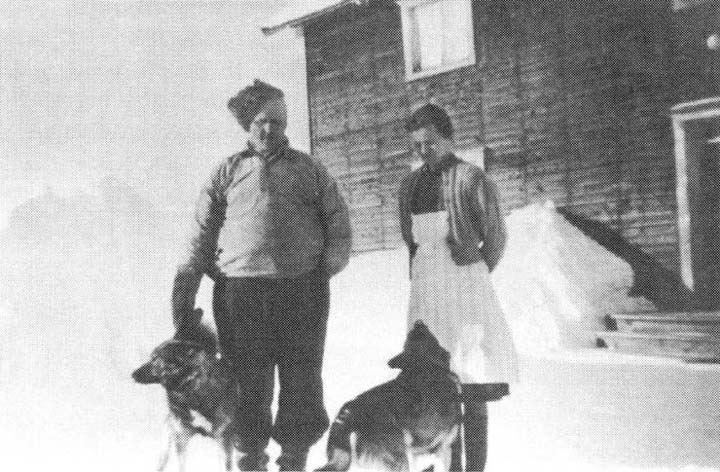 Emil och Jenny Holmkvist med hundarna Snabb och Fast framför det gamla huset på Näset.