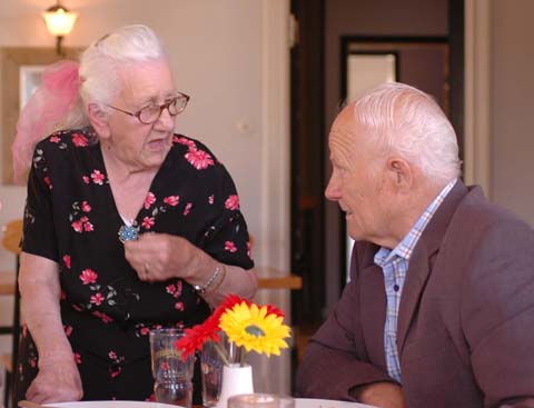 Sofia i samspråk med gästerna. Här med Sigfrid Jonsson.