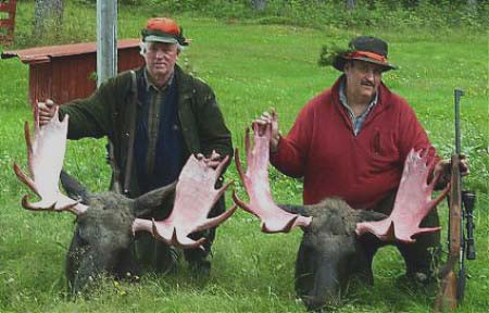 Skyttarna Nils-Erik Öst och Jan Hansson. Foto: Stefan Sundkvist TÅ I Sunnansjö vid Saxvattnet fälldes i måndags (3/9 2007) två 20-taggare inom loppet av några minuter av Carl-Gerhard Sjölanders jaktlag. Den första fälldes vid Saxvattnets utlopp mot Österåriset och den andra ca en km norrut mot gamla Kälsboern. Dessutom skjöts dagen efter två kalvar vid Grysjötjärn. Även en björn sköts i Sunnansjö på måndagen av ett annat jaktlag.