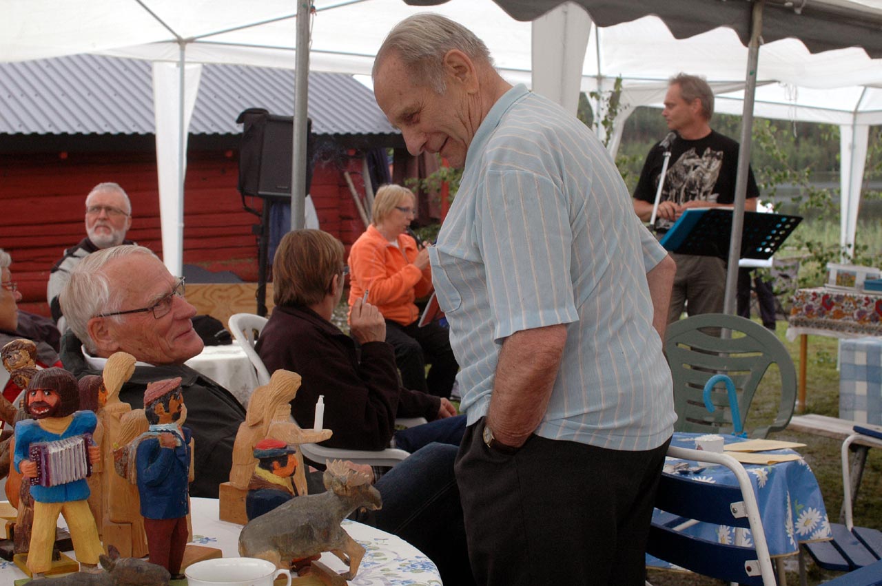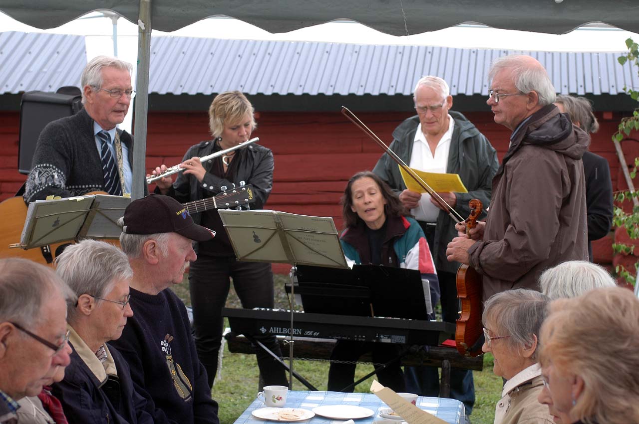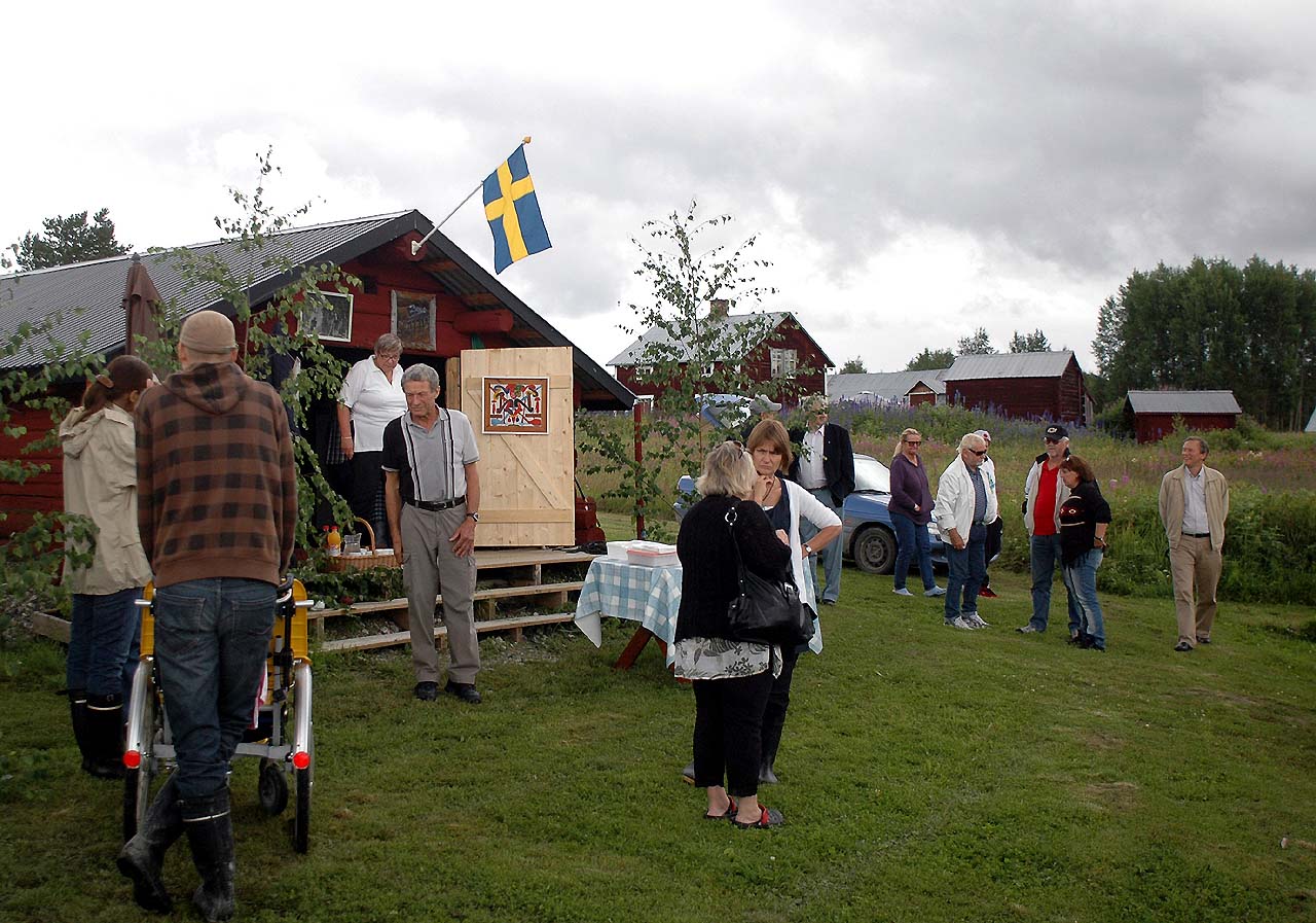 Det ser ut att bli en fin dag. Besökare börjar komma. Så kommer regnet, inte duggregn utan störtregn. Flera tappra besökare med paraply stövlar regnkläder väller in. Verkar inte bry sig om regnet. Prästen anländer med kyrkomusiker. Gudstjänsten börjar, men överröstas av regnet. Höbäckstrion gör så gott dom kan för att underhålla. Men regnet det bara öser ner. Det bjuds på gott kaffe med mycket gott hembakat bröd. Alla väntar tåligt på att regnet ska sluta. I ladan är det kö fö att titta på konstutställningen. Det kommer mer folk. Dom tappra vid kaffekokninen kämpar vidare. En dag med trängsel under tälten i ladan som jag tror alla som var där kommer att minnas med glädje. Berikad med gästvänlighet musik och konst, andlighet från en liten by i västra Junsele. Välkommen åter nästa sommar!