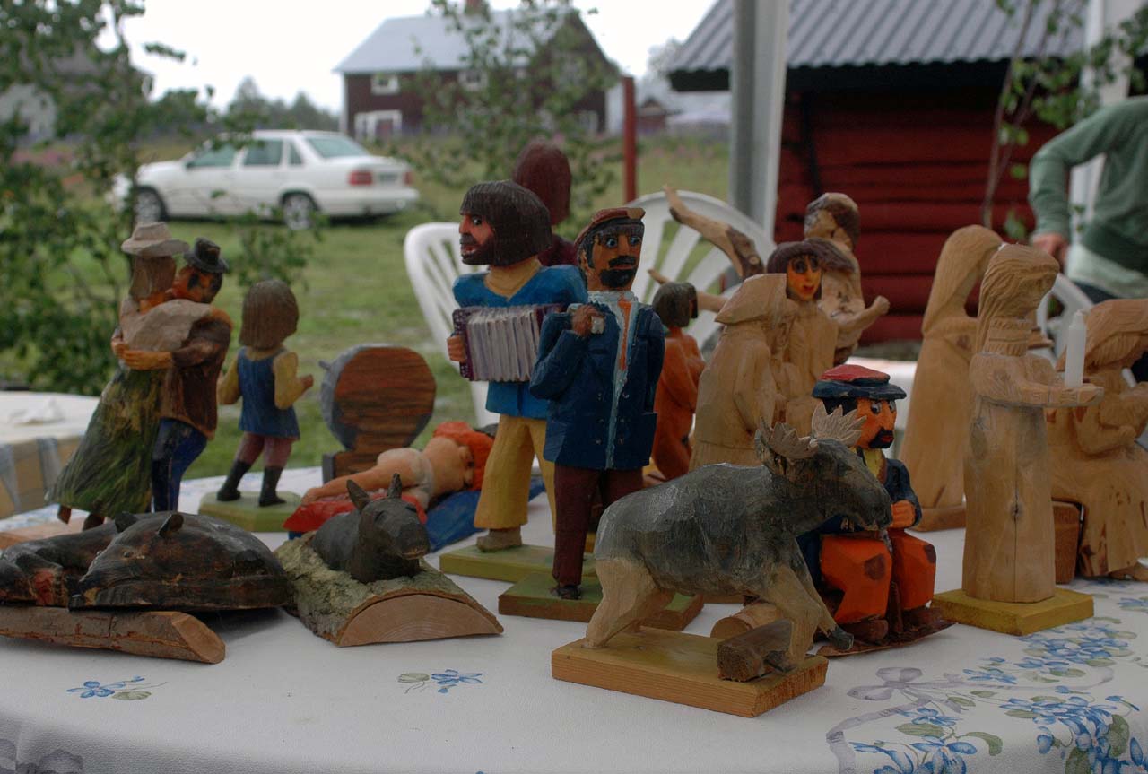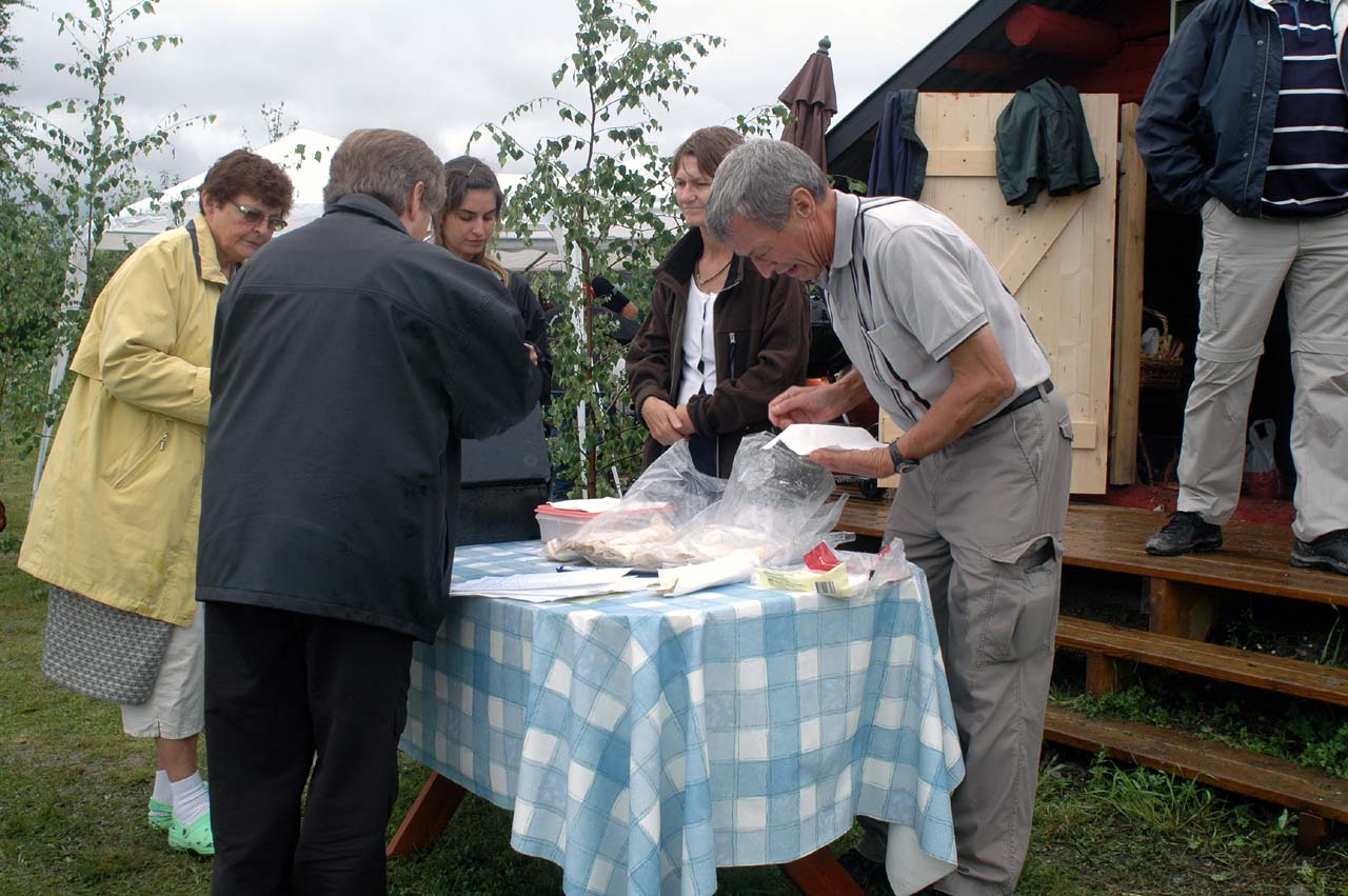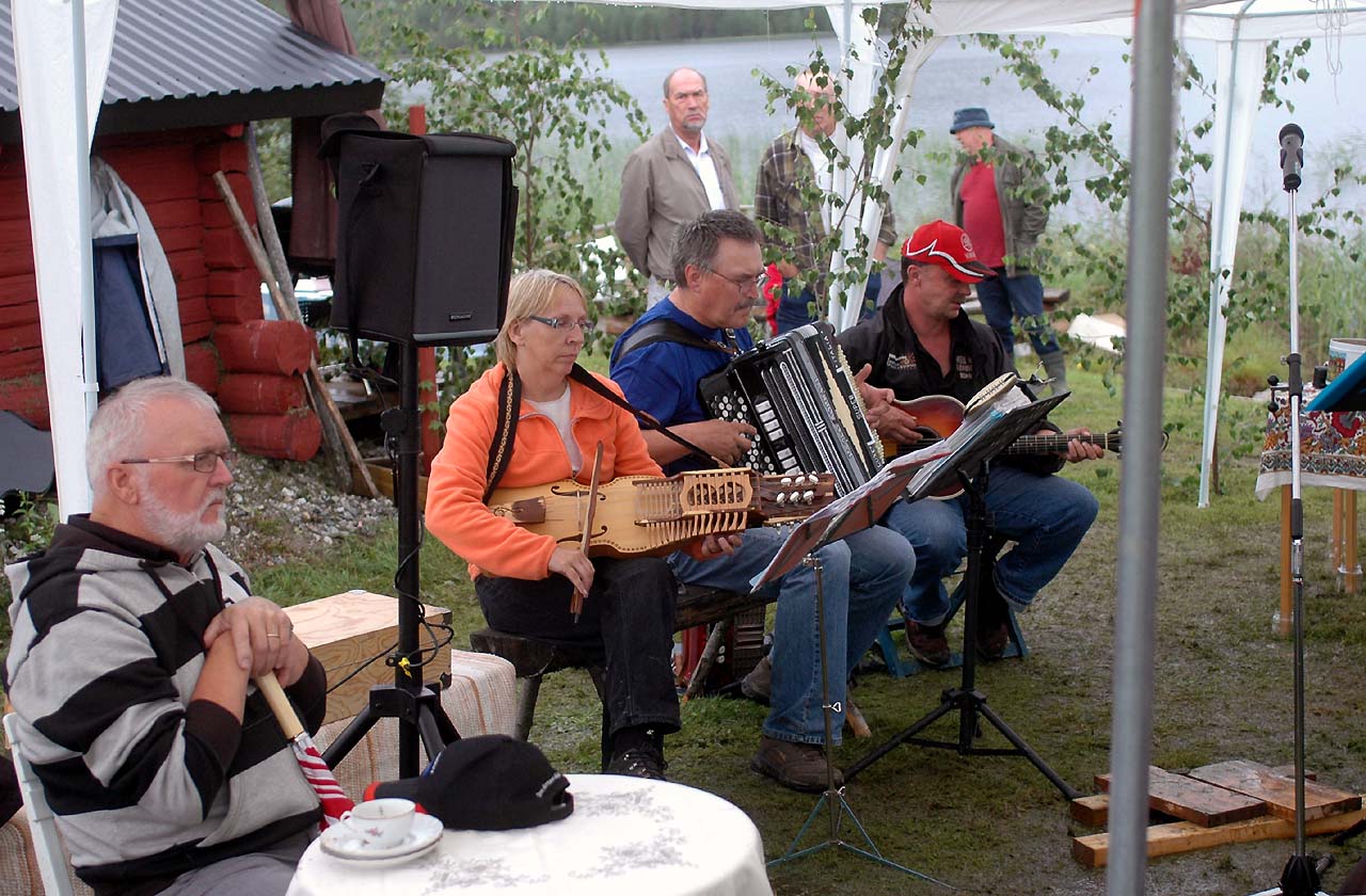 Det ser ut att bli en fin dag. Besökare börjar komma. Så kommer regnet, inte duggregn utan störtregn. Flera tappra besökare med paraply stövlar regnkläder väller in. Verkar inte bry sig om regnet. Prästen anländer med kyrkomusiker. Gudstjänsten börjar, men överröstas av regnet. Höbäckstrion gör så gott dom kan för att underhålla. Men regnet det bara öser ner. Det bjuds på gott kaffe med mycket gott hembakat bröd. Alla väntar tåligt på att regnet ska sluta. I ladan är det kö fö att titta på konstutställningen. Det kommer mer folk. Dom tappra vid kaffekokninen kämpar vidare. En dag med trängsel under tälten i ladan som jag tror alla som var där kommer att minnas med glädje. Berikad med gästvänlighet musik och konst, andlighet från en liten by i västra Junsele. Välkommen åter nästa sommar!